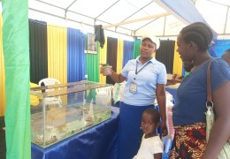 Mtaalamu wa Masuala ya Uvuvi kutoka Halmashauri ya Mji wa Kahama Bi. Pendo Matulanya akitoa elimu ya ufugaji wa samaki wa Mapambo kwa wanafunzi waliofika kwenye maonesho ya Nanenane.